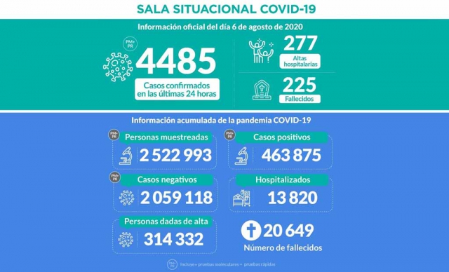 ERP. A 20,649 se elevó el número de fallecidos a causa del coronavirus covid-19 en Perú; mientras que los casos positivos totalizan 463,875; informó el Ministerio de Salud (Minsa). Hasta las 00:00 horas del día 7 de agosto de 2020 se han procesado muestras para 2 522 993 personas por la COVID-19, obteniéndose, 463 875 resultados positivos y 2 059 118 negativos.
