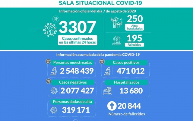 ERP. A 20,844 se elevó el número de fallecidos a causa del coronavirus covid-19 en Perú; mientras que los casos positivos totalizan 471,012; informó el Ministerio de Salud (Minsa). Hasta las 00:00 horas del día 8 de agosto de 2020 se han procesado muestras para 2 548 439 personas por la COVID-19, obteniéndose, 471 012 resultados positivos y 2 077 427 negativos.