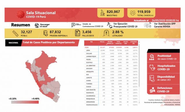 ERP. A 3,456 se elevó el número de fallecidos a causa del coronavirus covid-19 en Perú; mientras que los casos positivos totalizan 119,959; informó el Ministerio de Salud (Minsa). Al 24 de mayo de 2020 se han procesado muestras para 820 967 personas por Covid-19, obteniéndose, hasta las 00:00h, 119 959 resultados positivos y 701 008 negativos.