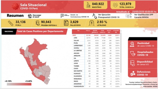 ERP. No hay meseta y menos disminución de los casos de Covid-19; los contagiados siguen aumentando y los muertos sumando de acuerdo al informe que realiza diariamente el Ministerio de Salud. Al 25 de mayo, se reporta 123,979 afectados por la terrible enfermedad, en tanto que los fallecidos suman 3,629, habiéndose realizado 840,922 pruebas de diagnóstico en todo el territorio nacional.