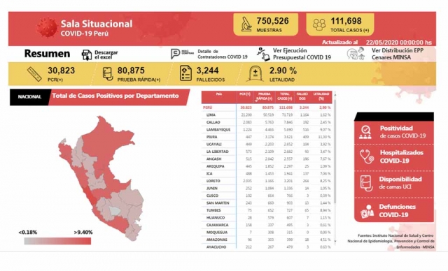 ERP. A 3,244 se elevó el número de fallecidos a causa del coronavirus covid-19 en Perú; mientras que los casos positivos totalizan 111,698; informó el Ministerio de Salud (Minsa). Al 22 de mayo de 2020 se han procesado muestras para 750 526 personas por Covid-19, obteniéndose, hasta las 00:00h, 111 698 resultados positivos y 638 828 negativos.