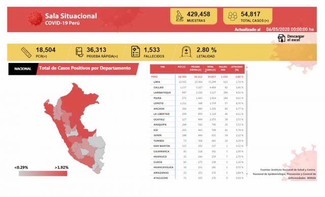 ERP. El número de fallecidos por Covid-19 en el país se elevó a 1,533 y a 54,817 los casos positivos, informó el Ministerio de Salud (Minsa). Al 06 de mayo de 2020 se han procesado muestras para 429 458 personas por Covid-19, obteniéndose, hasta las 00:00h, 54 817 resultados positivos y 374 641 negativos.