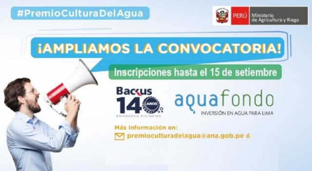 ERP. Tras recibir múltiples pedidos de los postulantes al IV Premio Nacional Cultura del Agua 2019, la Autoridad Nacional del Agua (ANA), adscrita al Ministerio de Agricultura y Riego (Minagri), amplía las inscripciones a este importante certamen que busca reconocer y valorar las exitosas experiencias de uso eficiente, conservación y protección de la calidad del recurso hídrico, y busca fomentar la cultura del agua, promoviendo la valoración económica, ambiental y sociocultural del agua.