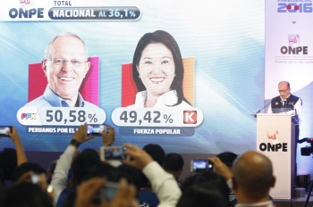 ERP. Los resultados oficiales preliminares de la Oficina Nacional de Procesos Electorales –ONPE- responsable de organizar el proceso y de realizar el cómputo, en el 91,010% de actas contabilizadas y 92,554% de procesadas, ratifica el triunfo de Pedro Pablo Kuczynski como virtual presidente de la República peruana con el 50,32% de los votos válidos, contra el 49,68% de Keiko Fujimori.