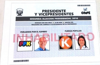 ERP. Pedro Pablo Kuczynski de Peruanos por el Kambio en la lado izquierda y Keiko Fujimori de Fuerza Popular en el lado derecho, esa es la distribución de la cédula de votación. La Oficina Nacional de Procesos Electorales (ONPE) presentó hoy la cédula de sufragio que se usará el 5 de junio, día en que los peruanos elegirán al próximo presidente de la República entre los candidatos Pedro Pablo Kuczynski y Keiko Fujimori.