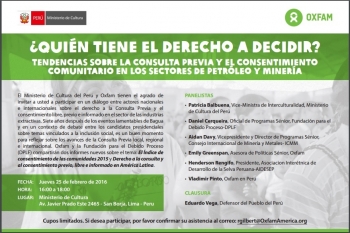 El vicepresidente del ICMM, Aidan Davy, con motivo de la celebración en Lima de la VII Conferencia Internacional de la Iniciativa para la Transparencia en las Industrias Extractivas (EITI, en sus siglas en inglés), participará como panelista el jueves a las 4pm en el evento "¿Quién tiene el derecho a decidir?", organizado por Oxfam y el Ministerio de Cultura, donde se analizará la puesta en marcha de la consulta previa en proyectos extractivos a nivel nacional e internacional.