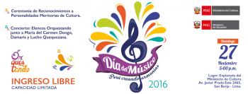 ERP. El Ministerio de Cultura y Ministerio de Educación se unirán para celebrar el "Día del Músico 2016", el domingo 27 de noviembre a las 5:00 p.m. en la Explanada del Ministerio de Cultura ubicado en el distrito de San Borja.