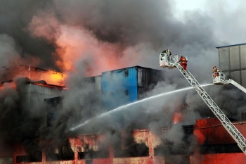 ERP. Bomberos hacen denodados esfuerzos para evitar que el dantesco incendio que consume desde el mediodía la galería Nicolini en el Cercado de Lima, se propague hacia un mercado que se encuentra a la espalda, en la alameda Las Malvinas.
