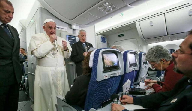 El Sumo Pontífice viaja a bordo del avión de la compañía Latam junto a su comitiva oficial, que lo acompañó en su visita a Chile.