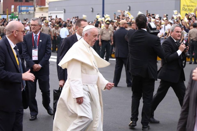 El Papa Francisco, quien esta tarde arribó al Perú en visita pastoral, fue recibido por cientos de fieles, quienes se apostaron a lo largo del recorrido que realizó desde el Grupo Aéreo N° 8 hasta la Nunciatura Apostólica.