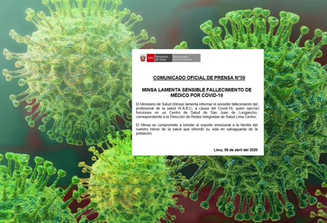 ERP. El COVID-19 cobró una víctima más en el país, con la particularidad que se trata de un profesional de la salud. W.A.B.C. prestaba servicios en el Centro de Salud del distrito de Juan de Lurigancho, Lima, correspondientes a la Dirección de Redes Integradas de Salud Lima Centro. La información fue confirmada por el Ministerio de Salud mediante Comunicado oficial de Prensa.