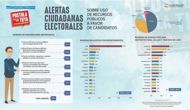ERP. El presunto uso de oficinas y recursos públicos con fines de propaganda electoral encabeza el ranking de alertas reportadas por los ciudadanos a través del programa POSTULA CON LA TUYA, de la Contraloría General de la República. Por incurrir en esta prohibición, que se enmarca como una infracción muy grave, podría recaer en la autoridad, funcionario o servidor público involucrado, hasta cinco años de inhabilitación para ejercer la función pública.