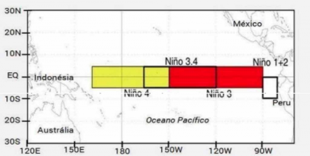 En el Pacífico ecuatorial central, la temperatura superficial del mar se mantuvo similar al mes anterior (octubre) con anomalías de +0.9 °C, mientras que en el extremo oriental las anomalías se incrementaron de 0.4 °C a 0.8 °C.