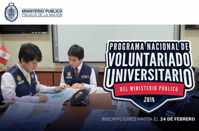 ERP. La Fiscalía de Tumbes dio inicio al Programa de Voluntariado Universitario 2019, dirigido a jóvenes universitarios o recién egresados de la carrera profesional de Derecho de las provincias de Tumbes, Contralmirante Villar y Zarumilla, que tengan interés de conocer y aprender de cerca la labor fiscal así como fortalecer sus conocimientos, habilidades y aptitudes profesionales en el ámbito jurídico.