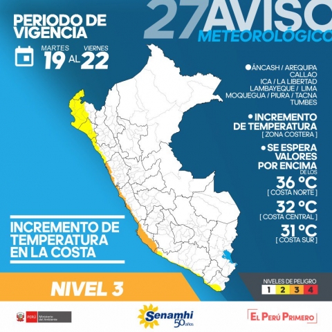 Según el pronóstico publicado por el SENAMHI se informa que desde el martes 19 hasta el viernes 22 de febrero, se incrementará la temperatura en la zona costera. En la costa norte se presentará valores por encima de los 36°C, en la costa central se superarán los 32°C, mientras que en la costa sur los valores estarán por encima de los 31°C.