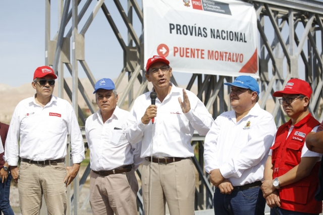 El presidente Vizcarra brindó declaraciones a la prensa en Moquegua, donde puso en funcionamiento la estructura modular que habilita el tránsito en el Puente Montalvo, con lo que se recupera la conectividad vial en la Panamericana Sur, en beneficio de la población.