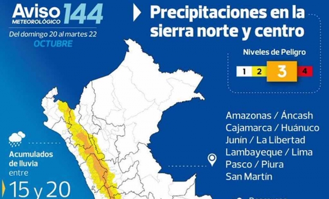 Las regiones comprendidas en este pronóstico son Amazonas, Áncash, Cajamarca, Huánuco, Junín, La Libertad, Lambayeque, Lima, Pasco, Piura y San Martín, precisó el Senamhi.