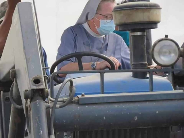 Religiosa conduce tractor con el que fumiga las calles del distrito de Moro en Ancash | Fotos cortesía.