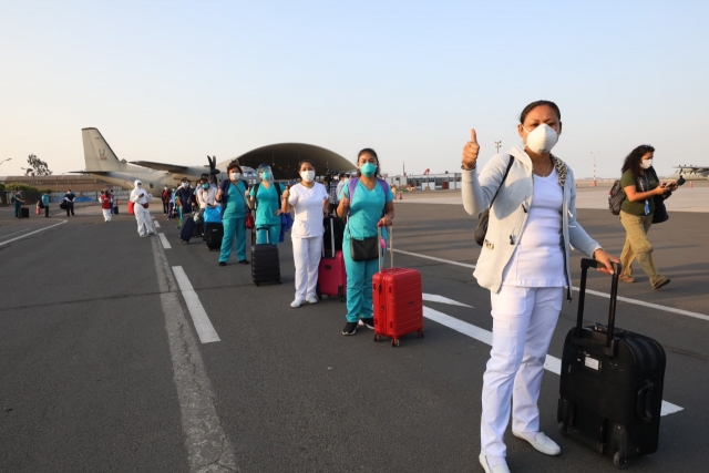 El personal especializado llegó al Grupo Aéreo Nº 8 en el Bus de la Selección Peruana de Fútbol. La delegación la integran, médicos generales (21), enfermeras (18), técnicas de enfermería (3), químicos farmacéuticos (4) y tecnólogos médicos (5).