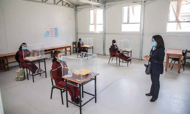 ERP. Después de siete meses, un total de 83 escolares de la institución educativa San Cristóbal, en la región Arequipa, retornaron a clases presenciales bajo estrictos protocolos sanitarios para prevenir la propagación del nuevo coronavirus (covid-19). Los estudiantes de primaria y secundaria asistieron con mascarilla y protector facial; los docentes se sometieron antes a pruebas moleculares de descarte del covid-19 y las carpetas fueron acondicionadas con micas que aíslan al escolar de sus compañeros.
