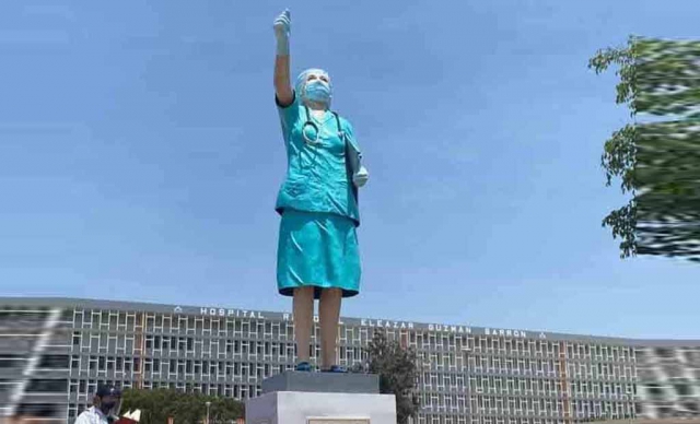 La enorme estatua se encuentra ubicada en la avenida Brasil, cerca del hospital regional Eleazar Guzmán Barrón, centro de referencia covid-19, donde los hombres y mujeres de turquesa han librado – y aún lo siguen haciendo – grandes batallas para estabilizar a los pacientes que se infectaron con el SARS-CoV-2.
