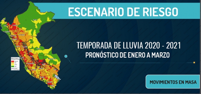 Los “Escenarios de Riesgos para la Temporada de Lluvias 2020-2021” elaborado por el centro nacional, han identificado un total de 3.768.175 personas que estarían en riesgo muy alto ante la ocurrencia de deslizamientos, flujos de detritos o huaycos entre otros tipos de movimientos en masa, en 351 distritos de 19 departamentos.