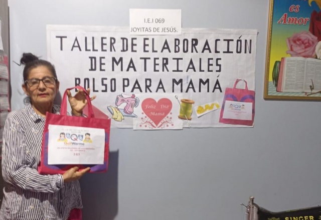 La líder de esta iniciativa es la presidenta del CAE, Vilma Prado, directora de esta escuela de educación inicial, quien aparece en las reuniones vía Zoom con su máquina de coser y enseña a 90 mujeres cómo aprovechar blusas, pantalones y otras prendas que ya no se usan en casa para confeccionar talegas coloridas y resistentes.