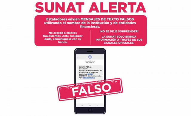 ERP. Estafadores pretenden sorprender a los ciudadanos con mensajes falsos. La Superintendencia Nacional de Aduanas y de Administración Aduanera (SUNAT) advierte a los ciudadanos a no dejarse sorprender por publicaciones falsas que, de manera reiterada, circulan en redes sociales como WhatsApp, mediante las cuales se pretende estafar con la supuesta retención de dinero de cuentas bancarias.