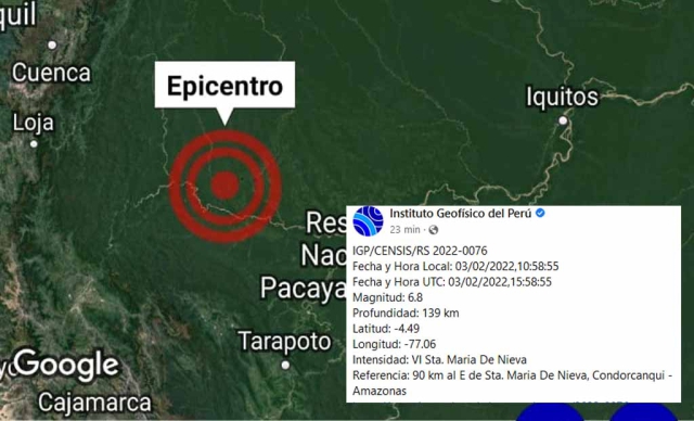 ERP. Un sismo de magnitud 6.8 remeció la región Amazonas esta mañana, reportó el Instituto Geofísico del Perú (IGP). El epicentro del sismo -sentido a las 10:58:55 a.m.- se ubicó a 107 kilómetros de Santa María de Nieva, en la provincia de Condorcanqui, a una profundidad de 139 kilómetros.