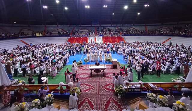 Por la tarde, en una celebración eucarística, que se realizó en el Coliseo Municipal “Palacio de los Deportes” de Andrés Araujo, y fue concelebrada por el Rev. Mons. Rafael Egüéz Beltrán, Vicario General de Tumbes, el R.P. Jimmy Coveñas Pacheco, Vicario Episcopal, el R.P. Carlos Rosillo Julca, Decano de la Zona, el R.P. Wilmer Córdova Guerrero y el R.P. Edgar Vite Chunga, un numeroso grupo de jóvenes provenientes de las Parroquias “San Nicolás de Tolentino”, “San José”, “San Martín de Porres” y “Señor de los Milagros” de Tumbes, recibieron de manos de nuestro Pastor, la Plenitud del Espíritu Santo. A esta gran alegría se unieron también una gran multitud de fieles cristianos, así como los padrinos, catequistas, familiares y amigos de los confirmandos.