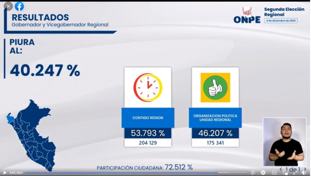 De acuerdo al primer avance correspondiente al 40.247% de la contabilización, en la región Piura el Movimiento Regional Contigo Región que tiene como candidato a Luis Neyra León obtiene el .53.793% de los votos válidamente emitidos en tanto que Reynaldo Hilbck Guzmán el 46.207%. La participación ciudadana fue del 75.512%.