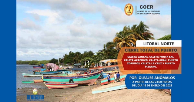 ERP. La Capitanía de Puerto de Zorritos de la Marina de Guerra del Perú dispuso el cierre total de puertos, caletas y desembarcaderos ubicados en la región Tumbes debido a la presencia de un nuevo de oleajes anómalos en el litoral norte peruano.