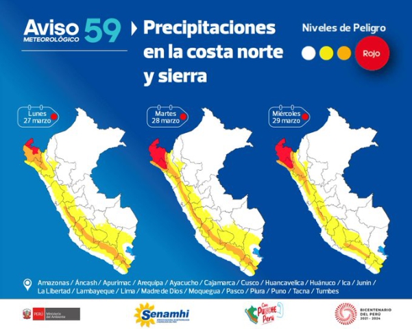 "El Senamhi informa que, entre el lunes 27 al miércoles 29 de marzo, se presentarán precipitaciones (nieve, granizo, aguanieve y lluvia) de moderada a extrema intensidad en costa norte y sierra. Estas precipitaciones estarán acompañadas de descargas eléctricas y ráfagas de viento, con velocidades cercanas a los 35 km/h. Además, se espera la ocurrencia de granizo de forma localizada en zonas por encima de los 2800 m. s. n. m.; nieve con acumulados de alrededor de 7cm en localidades de la sierra sur y centro, sobre los 4000 m. s. n. m. Asimismo, se prevé la ocurrencia de lluvia localizada de ligera a moderada intensidad hacia la costa centro y sur" indica Senamhi en la Alerta 59.