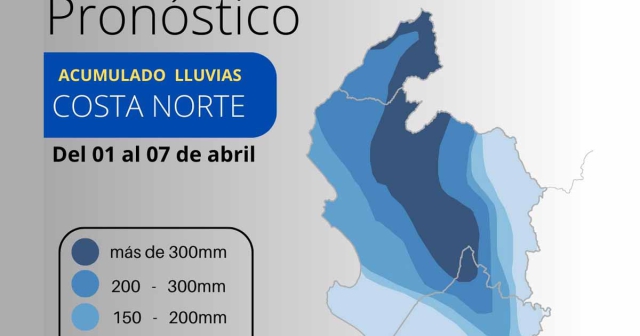 ERP. El Servicio Nacional de Meteorología e Hidrología del Perú - Senamhi, informa que se presentarán episodios de lluvia de fuerte a extrema intensidad en la costa norte, teniendo los acumulados de lluvia más altos en Piura y Tumbes, hasta la quincena de abril. Durante la primera semana (desde el 1 al 7 de abril) se esperan acumulados superiores a los 300 mm/semana, principalmente en las provincias de Sullana (Piura) y Zarumilla (Tumbes); acumulados entre 200 – 300 mm/semana, principalmente en las provincias de Tumbes, Contraalmirante Villar (Tumbes) y Talara, Paita, Piura (Piura).