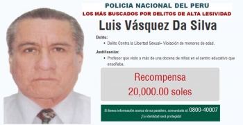 ERP/Cajamarca. Estado ofrece S/. 20,000 de recompensa. A solicitud de la Policía Nacional del Perú, la Comisión Evaluadora de Recompensas Contra la Criminalidad decidió incluir en la segunda lista de los más buscados a Luis Vásquez Da Silva, docente de una institución educativa de la región Cajamarca acusado del delito contra la libertad sexual, en la modalidad de violación sexual, en agravio de menores de edad.