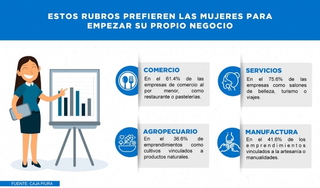 ERP. Las peruanas cumplen un papel activo en el sector empresarial, porque crean y desarrollan sus propias empresas. Según el INEI, en el Perú, se estima que 52.1% de las empresas que se crearon en el último trimestre del 2018 fueron emprendimientos de mujeres. En esta infografía, Caja Piura te presenta los rubros que ellas prefieren para iniciar su negocio y empoderarse: