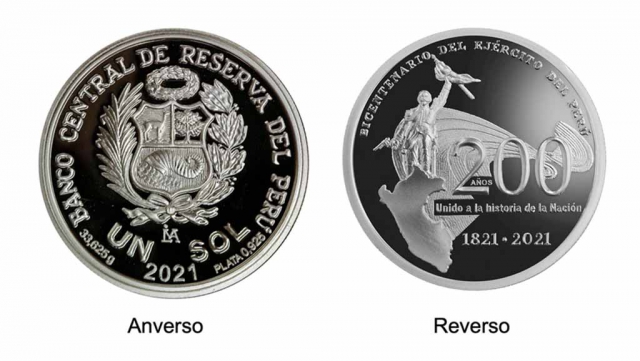 ERP. El Banco Central de Reserva (BCR) pone hoy en circulación una moneda de plata alusiva al bicentenario del Ejército del Perú. Mediante la Circular 0023-2021-BCRP, publicada hoy en el diario oficial El Peruano, se indican las siguientes características de la moneda en mención: