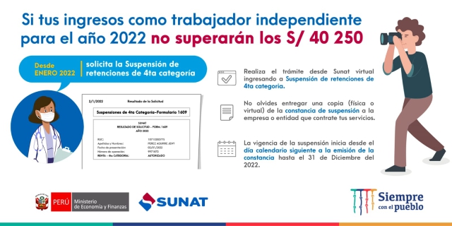 Pueden presentar esa solicitud aquellos trabajadores independientes que proyectan que sus ingresos en el 2022 no van a superar el monto de S/ 40,250.00 por el ejercicio de profesión, arte u oficio.