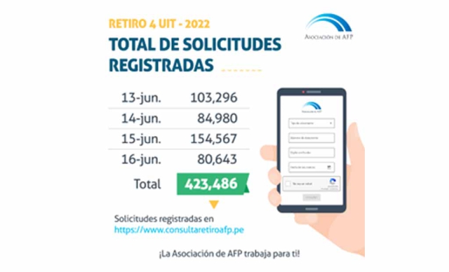 ERP. En los primeros cuatro días de iniciado el cronograma para registrar el retiro de hasta 4 Unidades Impositivas Tributarias (UIT) se han atendido un total de 423,486 solicitudes de los afiliados al Sistema Privado de Pensiones (SPP), informó la Asociación de AFP.