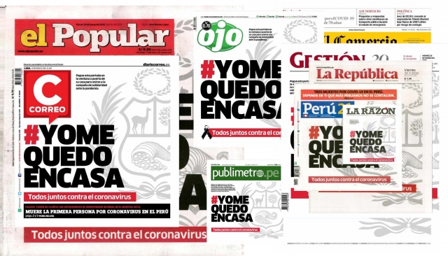 ERP. Los medios de comunicación escritos del país, se pusieron de acuerdo para lanzar sus ediciones con la frase #Yomequedoencasa, recomendación que va dirigida a la población peruana, como única alternativa para detener el avance del Covid-19 o coronavirus, conforme se ha dispuesto mediante Decreto Supremo al declararse la emergencia nacional sanitaria.