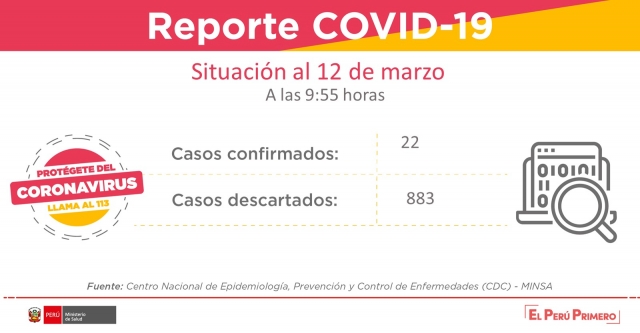 ERP. El Ministerio de Salud (Minsa) informó esta mañana que se elevó a 22 el número de infectados por coronavirus en el Perú, es decir cinco más que el día anterior. A través de un comunicado indicó que se han procesado 905 muestras por COVID-19, obteniendo 22 resultados positivos.