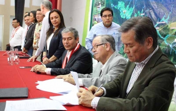 Piura. El gobernador regional de Piura, Ing. Reynaldo Hilbck, acompañado de la vicepresidenta de la República, Marisol Espinoza, y congresistas Karla Schaefer, Freddy Sarmiento y Juan José Díaz, miembros del Consejo Regional, alcaldes distritales y agricultores del Alto Piura, se realizó hoy la firma de contrato entre el Gobierno Regional y el Consorcio Peruano Italiano Obrainsa-Astaldi, para la ejecución del Primer Componente del Proyecto Alto Piura: Presa Tronera Sur y Túnel Trasandino.