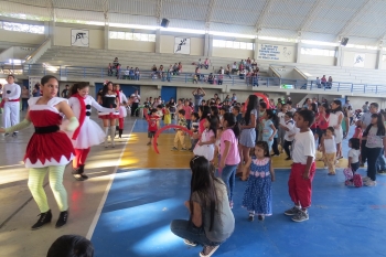 El Show artístico congregó a los menores al centro del coliseo para que disfruten de la representación del Nacimiento de Jesús, de los bailes, juegos y premios. Finalizado el mismo recogieron sus regalos.