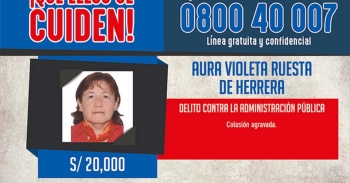 Entre los más buscados se encuentra la exalcaldesa del distrito piurano de Catilla, Aura Violeta Ruesta de Herrera (61), requisitoriada por la Primera Sala Penal de Apelación de Piura por el delito de colusión agravada, y por quien se ofrece 15 mil soles.