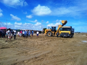 Desde el día de ayer, maquinaria pesada – 03 volquetes y 02 cargadores frontales- trabajan en la remoción de arena de la cantera del dren Maldonado para ser repartida a cientos de vecinos que habitan en los asentamientos humanos ubicados en el sector suroeste de Piura, en el distrito de Veintiséis de Octubre.