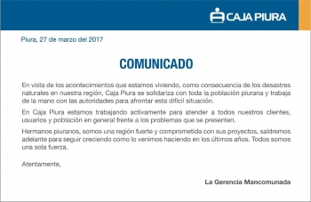 ERP. La Gerencia Mancomunada de Caja Piura informó que en vista de los acontecimientos que se están viviendo como consecuencia de los desastres naturales en la región, la micro financiera se solidariza con toda la población piurana y trabaja de la mano con las autoridades para afrontar esta difícil situación.