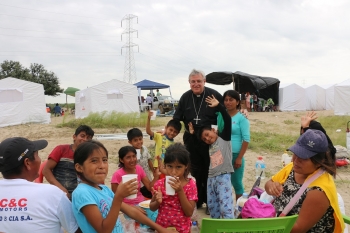 ERP. Cáritas Piura y Monseñor José Antonio Eguren Anselmi S.C.V., Arzobispo Metropolitano de Piura, visitaron los campamentos donde están siendo reubicadas las familias y personas que están siendo evacuadas de Pueblo Nuevo de Catacaos así como del Caserío Santa Rosa y los AA.HH. 09 de Diciembre, El Milagro y Alan García del Distrito de Cura Mori, debido al reciente desborde del Río Piura que inundó y arrasó sus viviendas y sembríos.