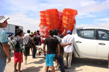 La ayuda fue transportada en cuatro camionetas de la Direpro Piura desde el Grupo Aéreo N°7 hasta el colegio Poeta César Vallejo en Chanto Grande (km 980), que funciona como almacén para los damnificados.