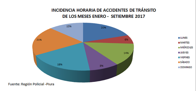De acuerdo a las estadísticas de la PNP Región Piura, el sábado es el día más común para sufrir un accidente dado que presenta un 20.5 % del consolidado anual, seguido del día lunes con un 19.8%, del viernes un 18.1% y del día miércoles cuya incidencia arroja 14.1%. El resto de días, es decir martes o jueves incluido el domingo, los niveles de ocurrencia tienden a bajar del 13.1 al 6.1 %.
