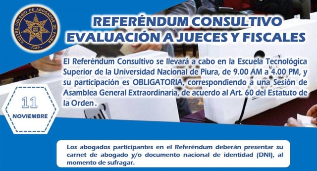 ERP. Los jueces y fiscales que prestan servicio en el distrito judicial de Piura, se someterán al denominado Referéndum Consultivo 2017 que organiza el Ilustre Colegio de Abogados de Piura, el mismo que se cumplirá este 11 de noviembre en las instalaciones de la Escuela Tecnológica Superior de la Universidad Nacional de Piura, en el horario de 9.00 am - 4.00 pm. No comprende el distrito judicial de Sullana.